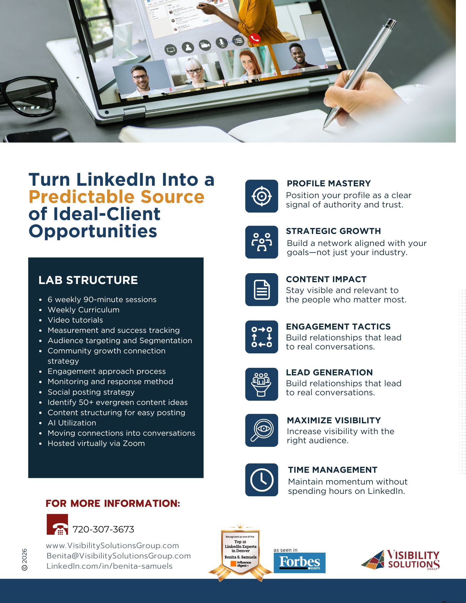 The LinkedIn Growth Lab is a 6-week, small-group program designed to ensure every participant receives individual focus, practical feedback, and real application.